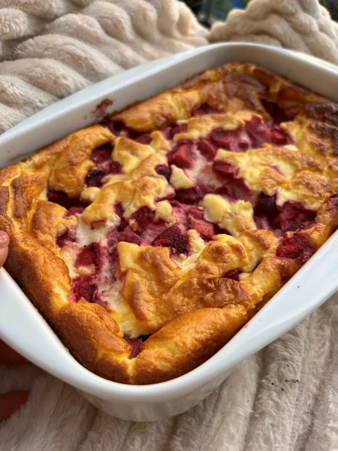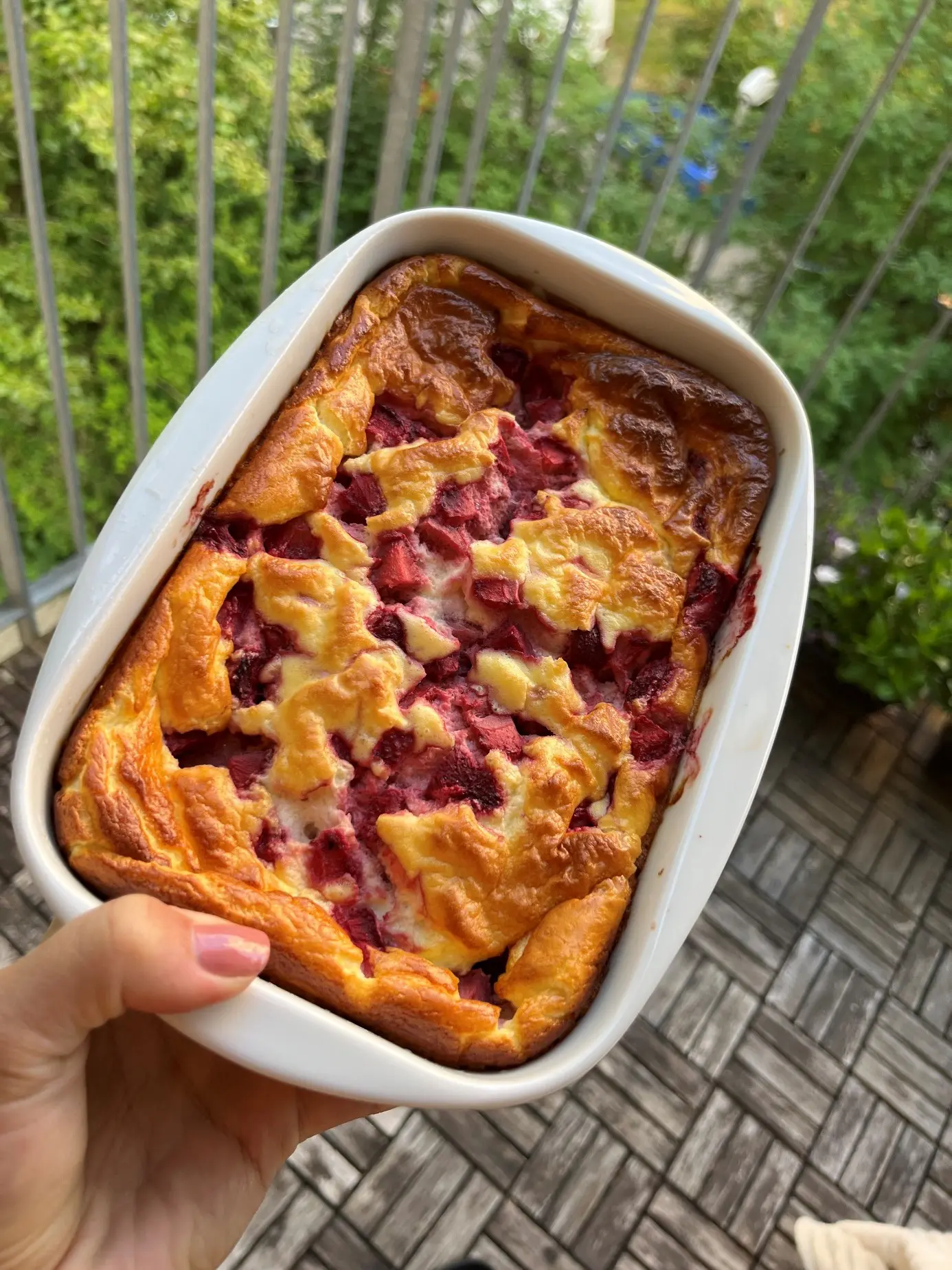 Vejce si rozdělíme na žloutky a bílky. Z bílků vyšleháme tuhý sníh. Ke žloutkům přidáme dva jogurty, protein a vymícháme do hladka. Poté jemně smícháme sníh s jogurtovou směsí a takto připravené těsto dáme do malého pekáčku a posypeme nakrájeným ovocem. Pečeme cca 30-40 minut (záleží hlavně na rozměrech formy, aby se dobře propekl) na 165 stupňů na horkovzduch. Výsledný „cheesecake“ pak necháme vychladnout a vy si můžete užít vynikající snídani, svačinu, či jen dezert.